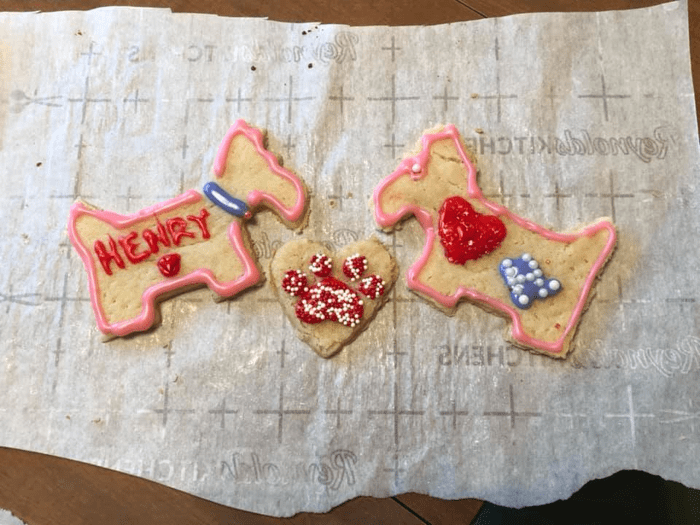 I had a schnauzer cookie cutter I got a few years back. I got it because it was a dog. And you know, I like dogs. While getting out cookie cutters for our Valentine’s Day cookies, I found the schnauzer cookie cutter. I told Kegan it looked like Henry Holcomb, who is the First Dog of Indiana. Thus, we decided to decorate Henry Holcomb cookies, and I for one thought they were pretty darn cute.